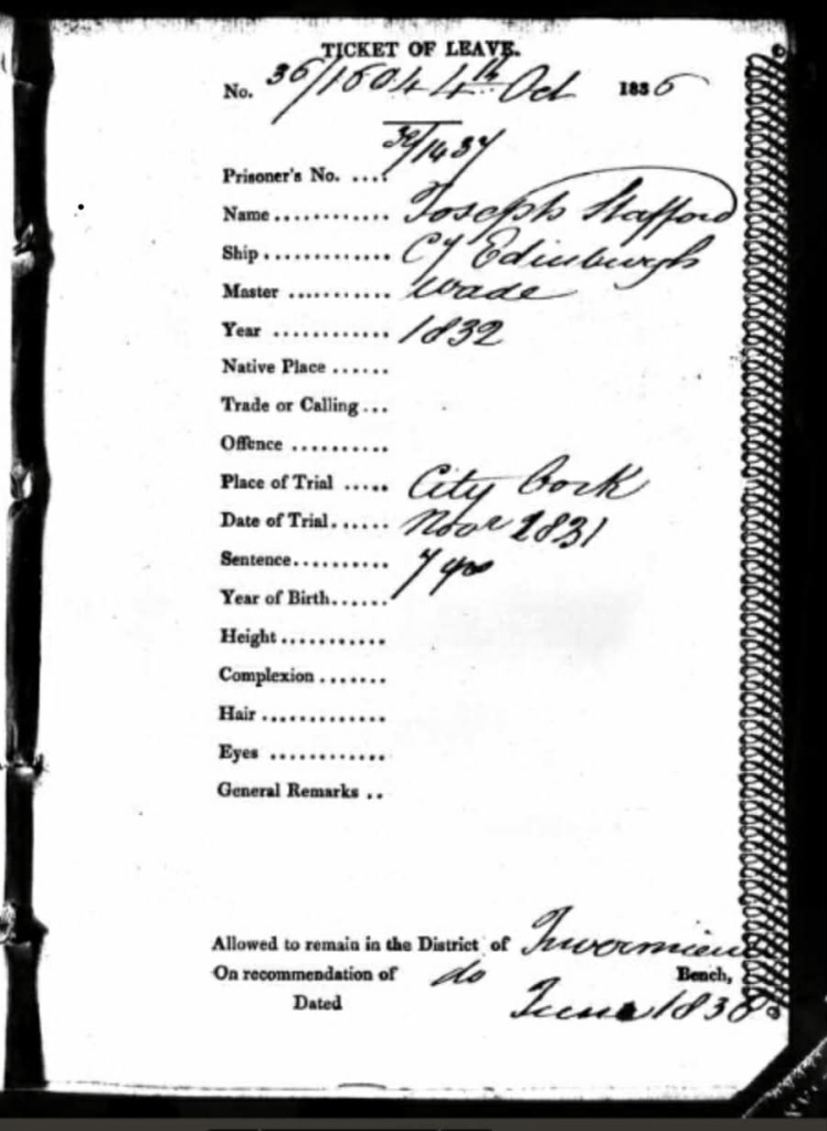 On 4 October 1836, Joseph Stafford received his Ticket of Leave.