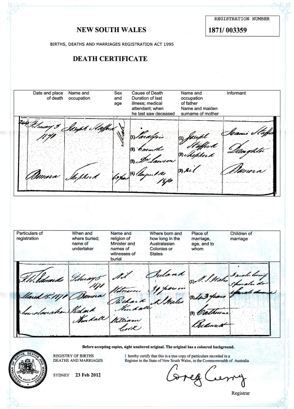 | 9 | Joseph | 15 August 1870 | 8955/1870 | Joseph Stafford | Catherine formerly Budsworth | Tinkrameanah, Coonabarabran, NSW |