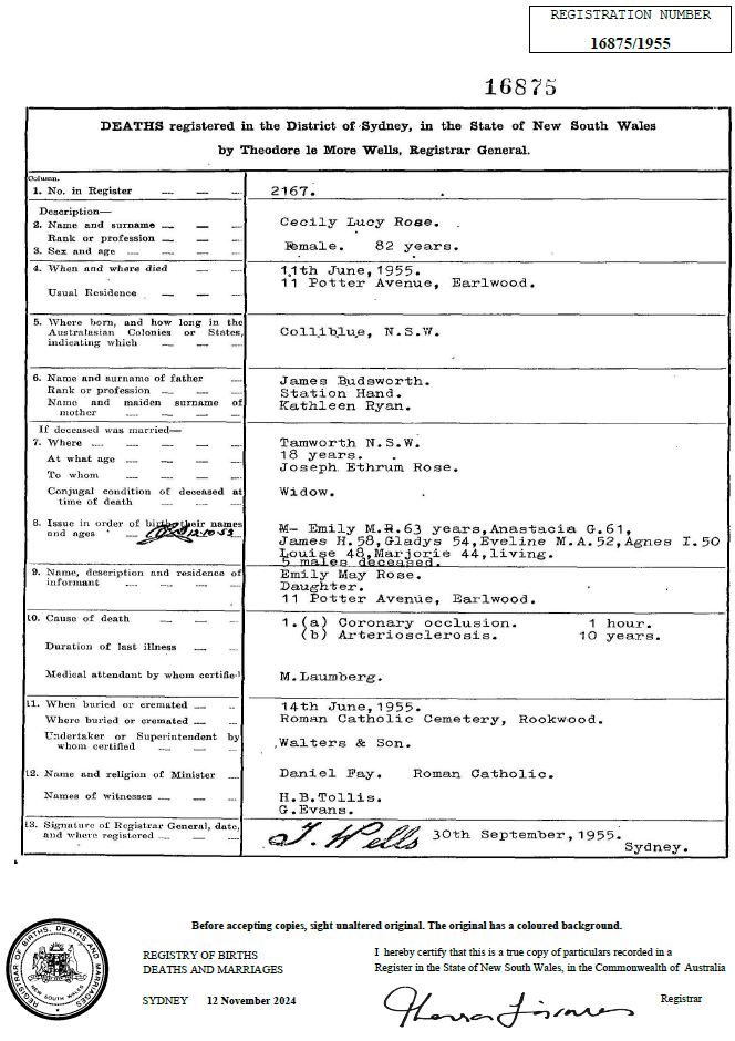 On 11 June 1955, Cicely died in Earlwood, NSW.