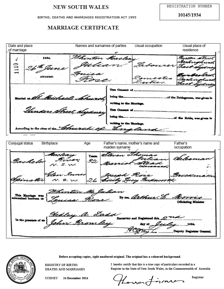 | 10 | Louisa | 1934 | 10145/1934 | Joseph Rose (Brickmaker) | Cicily Lucy Budsworth | St Michael’s Church, Flinders Street, Sydney, NSW | Whinton Mackay Julian |