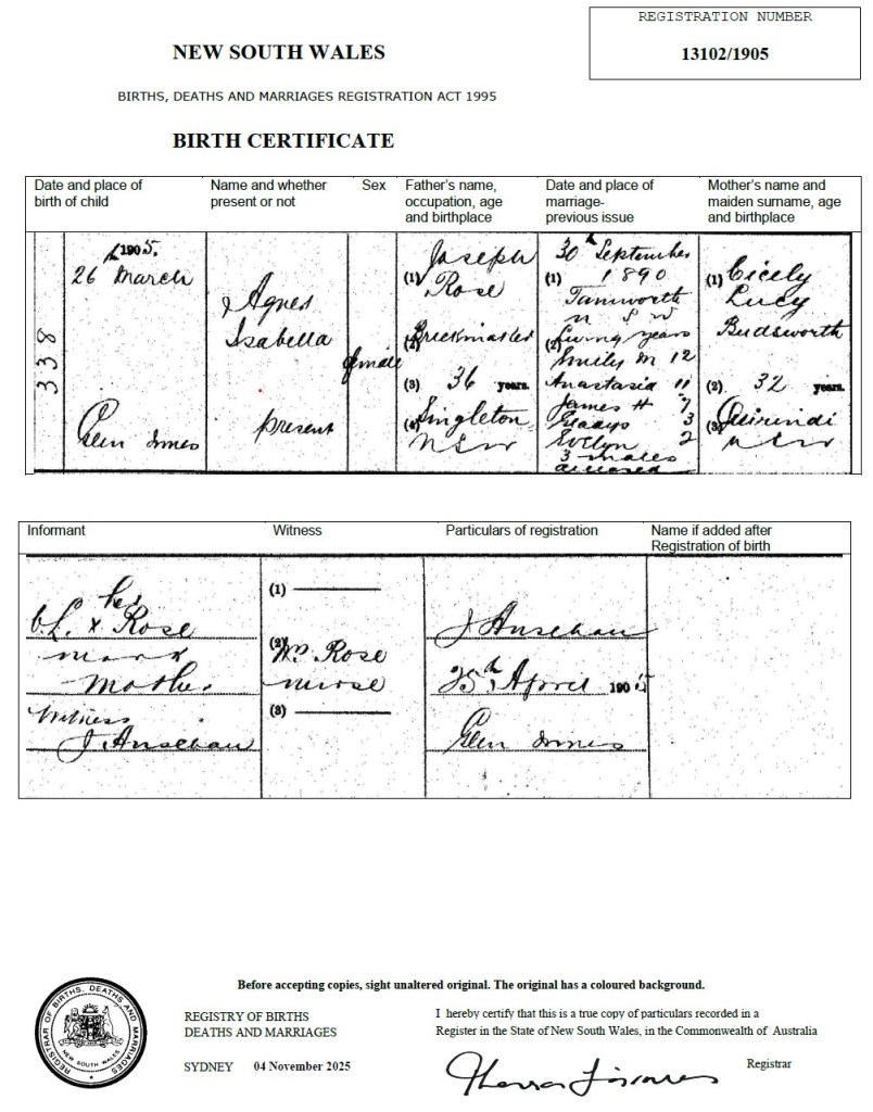 On 29 March 1905, Agnes Isobel Rose was born in Glen Innes, NSW.