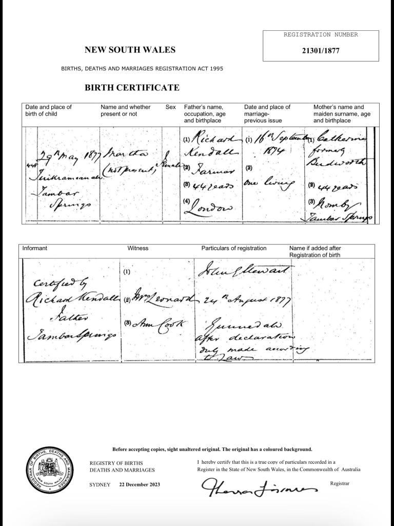 As per Catherne’s birth certificate, she was born at Nomby, Tambar Springs. Nomby is consistent with the land owned by George Cox and Henry Cox, as detailed earlier. A 1905 photograph of Nombi Station was published by the Art Gallery NSW in 1980.