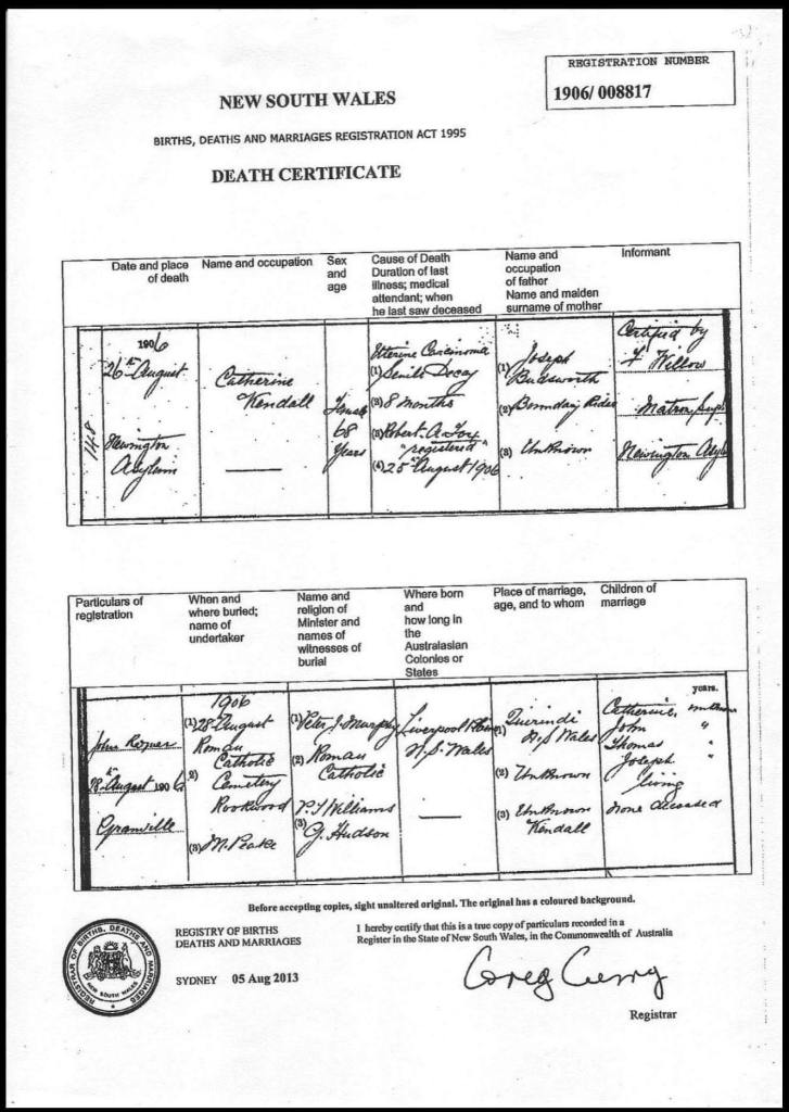 Catherine died 26 August 1906. Catherine’s death certificate states her father was Joseph Budsworth, and his occupation was ‘Boundary Rider’. It states the maiden surname of her mother was unknown.