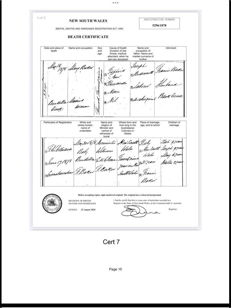 Died 18 May 1878. Mary’s death certificate states her father was Joseph Budsworth, and his occupation was ‘Laborer’. It states the maiden surname of her mother was “An Aboriginal”.