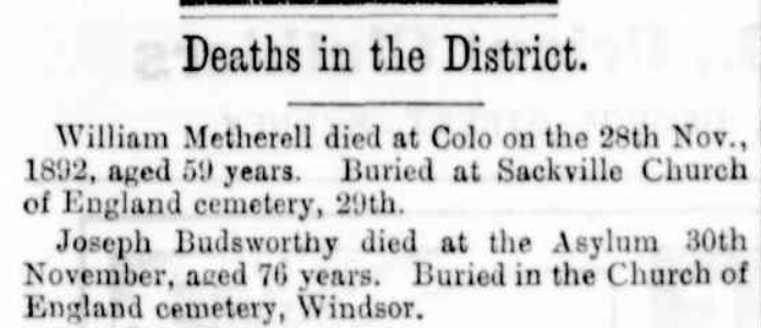 NOTE: The Hawkesbury Benevolent Asylum was founded in 1818 by Archibald Bell and William Cox, who Budworth had first been assigned to upon arriving in Australia as a convict, 63 years earlier.