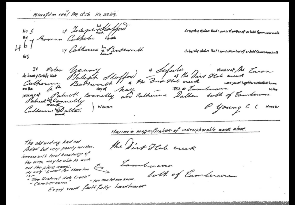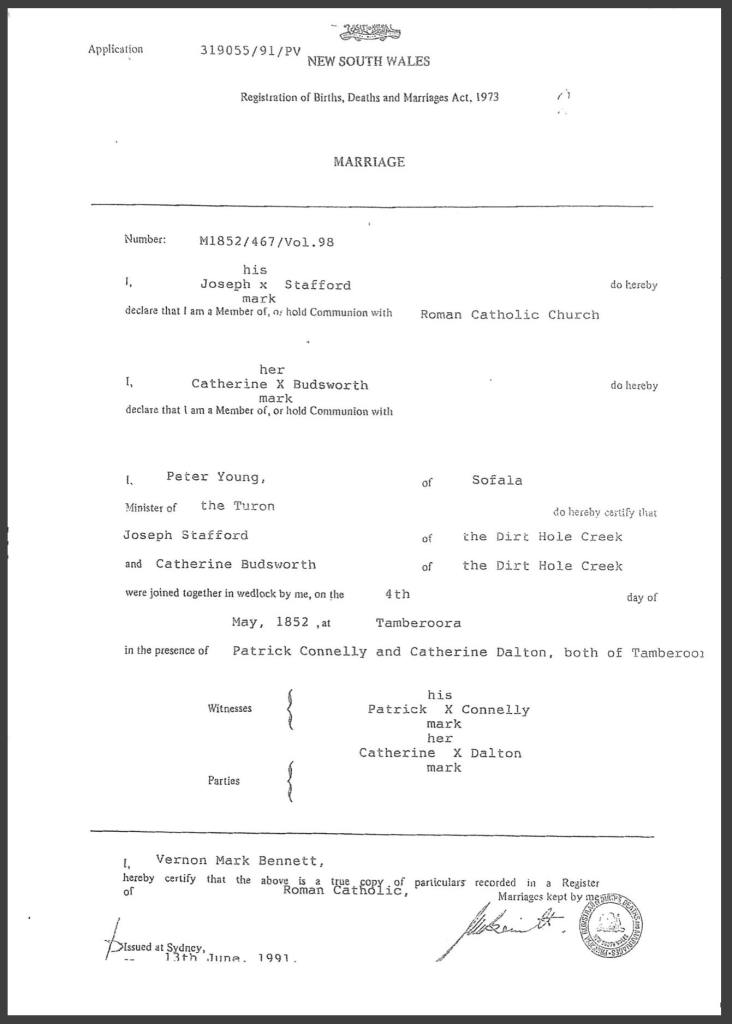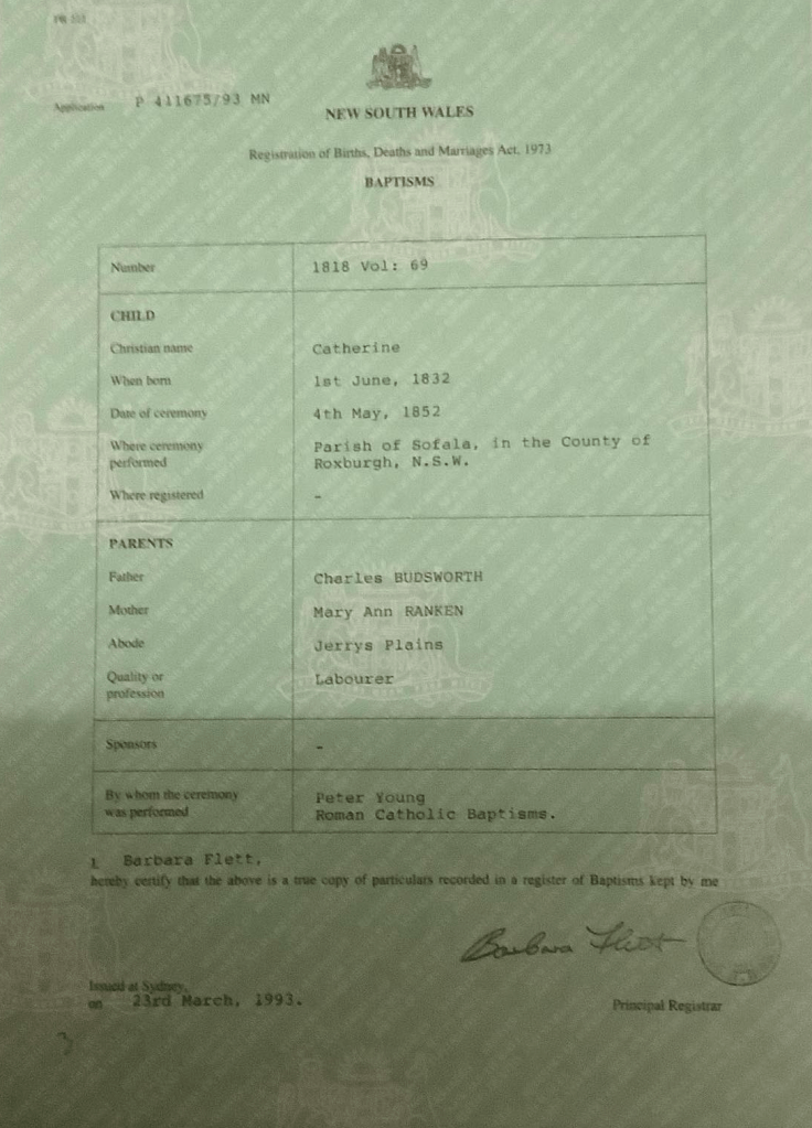 Baptised 22 October 1845 by J. T. Lynch, Roman Catholic. This baptism certificate states the father was Joseph Budsworth and the mother was Kitty Aborigini (sic). The parents abode was “American River”. The baptism ceremony was performed in the “Parish of West Maitland in the County of Northumberland NSW”.