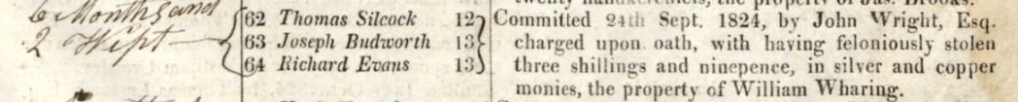 On 24 September 1824, Budworth was committed with having feloniously stolen three shillings and ninepence, in silver and copper monies.4