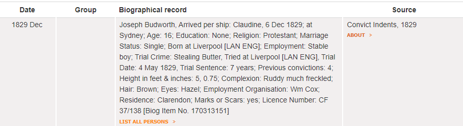On 4 May 1829 at the Liverpool Court, Budworth was tried for feloniously stealing butter, and at trial sentenced to 7 years transportation to Australia. He had four previous convictions at this time.9