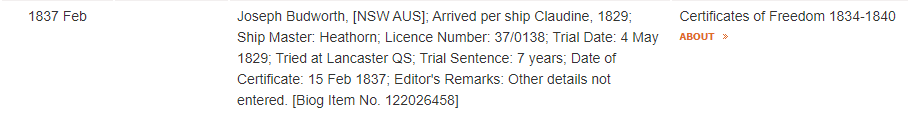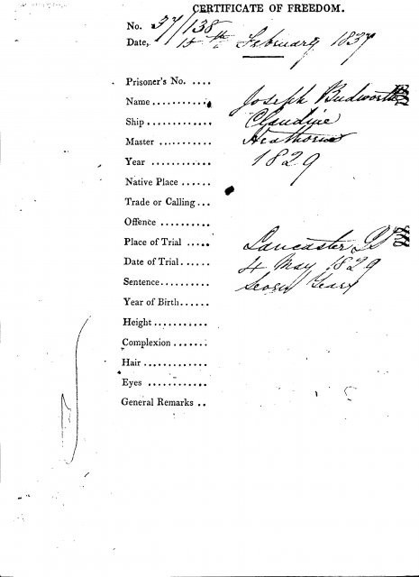 On 15 February 1837, Budworth received his ‘Certificate of Freedom’.