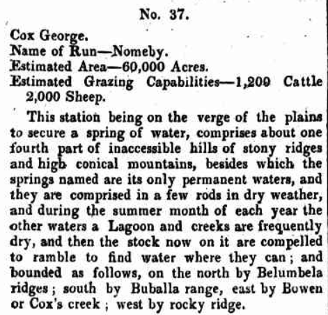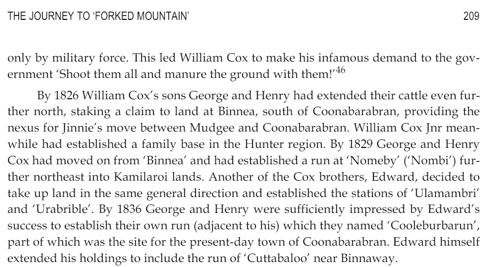 From 1826, three of Cox’s sons, George, Henry and Edward, progressively staked claims to the Liverpool Plains area including at Binnea, Noemby or Nombi, and Connabarabran.