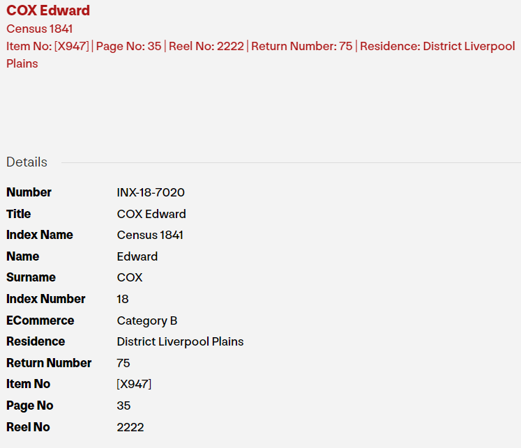Similarly, another of William Cox’s sons “Edward Cox”, was in residence on the “District Liverpool Plains”.