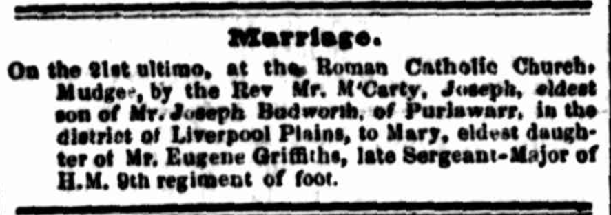 Baptised 1 June 1842 in West Maitland by J. T. Lynch, Roman Catholic. This baptism certificate states the father was Joseph Budsworth and his mother was Kitty Budsworth.