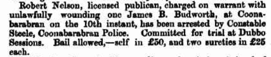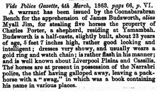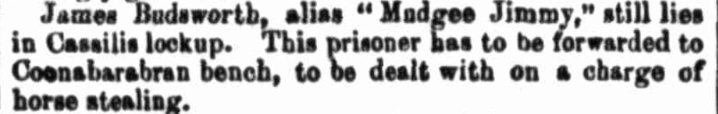 The 16 April 1863 Maitland Mercury and Hunter River General Advertiser Newspaper stated “James Budsworth, alias ” Mudgee Jimmy,” still lies in Cassilis lockup. This prisoner has to be forwarded to Coonabarabran bench, to be dealt with on a charge of horse stealing”.