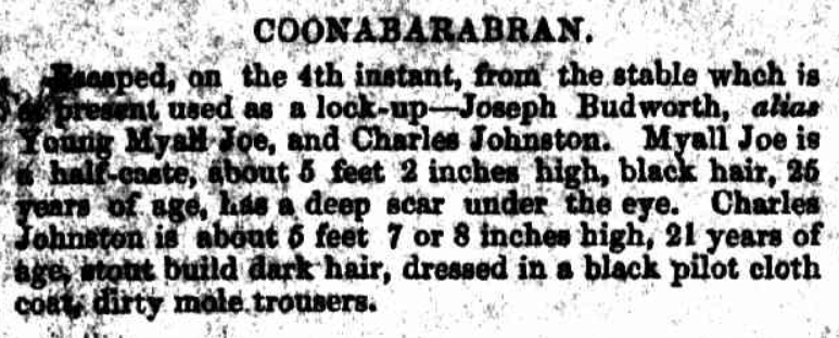 On 15 October 1860, it was reported in the New South Wales Police Gazette and Weekly Record of Crime “Coonabarabran: Escaped, on the 4th instant, from the stable which is at present used as a lock-up-Joseph Budworth, alias Young Myall Joe, and Charles Johnston. Myall Joe is a half-case, about 5 feet 2 inches high, black hair, 26 years of age, has a deep scar under the eye.