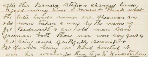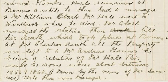 Hale remained at Bomera a while he then had a manager a Mr William Clark Mr Hale went to Windsor where he died. Mr Clark managed the station then till his death which took place at Bomera. At Mr Clarkes death all the property was left to a Mr Andrews Towns he being a relative of Mr Hale this would be some where about between 1850 & 1860. A man by the name of Mr Samuel) Hole was manager.