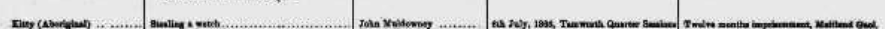 On 6 July 1866, the record “Return of Prisoners Tried at the Different Courts of Quarter Sessions, 1866, Tamworth Quarter Session, 6 July 1855” stated the following: Name: Kitty (Aboriginal) Offence: Stealing a watch. When and Where Tried: Tamworth Quarter Sessions. Sentence: Twelve months imprisonment, Maitland Gaol.