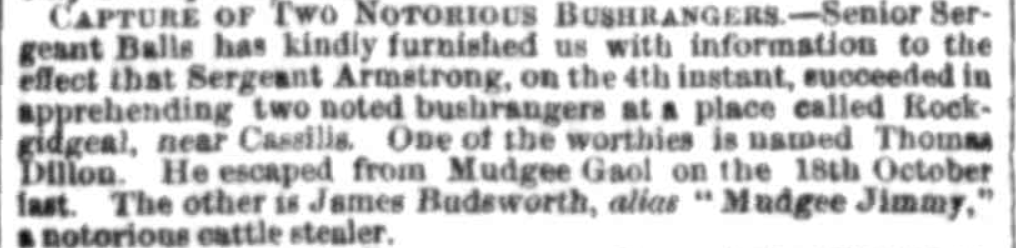 The 9 April 1863 Mercury and Hunter River General Advertiser Newspaper stated in an article “CAPTURE OF TWO NOTORIOUS BUSHRANGERS”, “Senior Sergeant Balls has kindly furnished us with Information to the effect that Sergeant Armstrong, on the 4th Instant, succeeded in apprehending two noted bushrangers at a place called Rockgidgeal, near Cassills. One of the worthies Is named Thomas Dilllon. He escaped from Mudgee Gaol on the 18th October last. The other is James Budsworth, alias “Mudgee Jimmy”, a notorious cattle stealer.