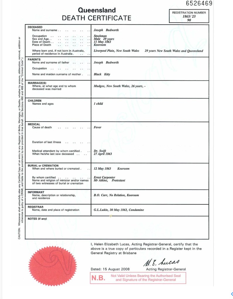 Died 11 May 1863 in Queensland. The death certificate states his father was Joseph BUDWORTH and his mother was Black Kitty.