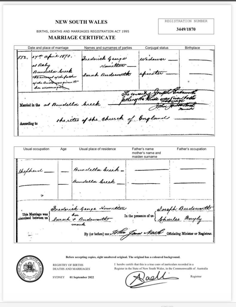On 24 April 1870, Sarah married Frederick George Hamilton. Their usual place of residence is both recorded as ‘Bundella Creek’.