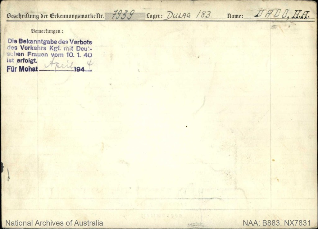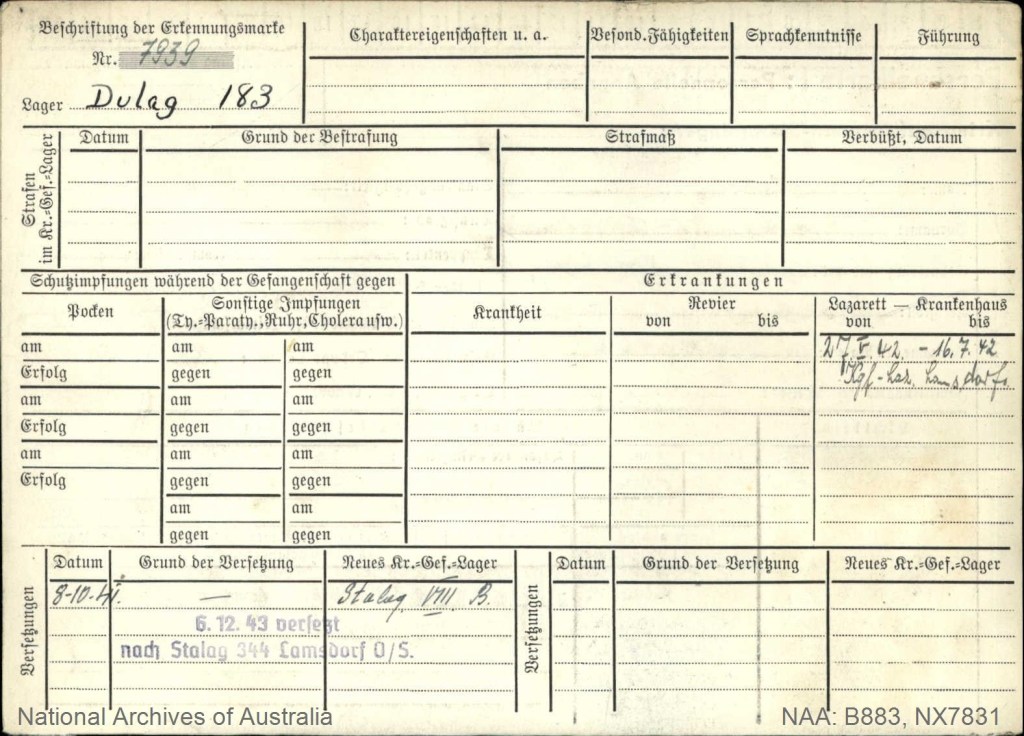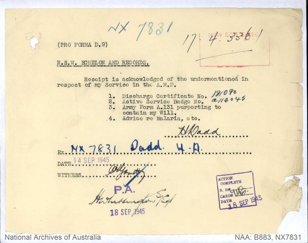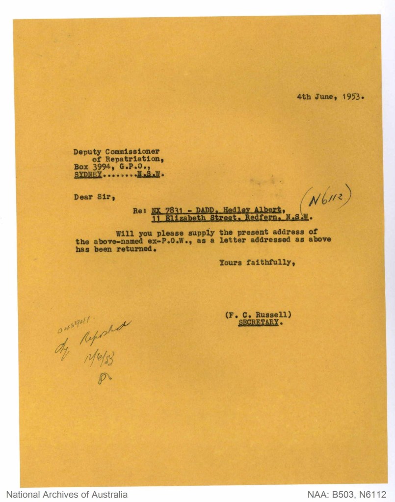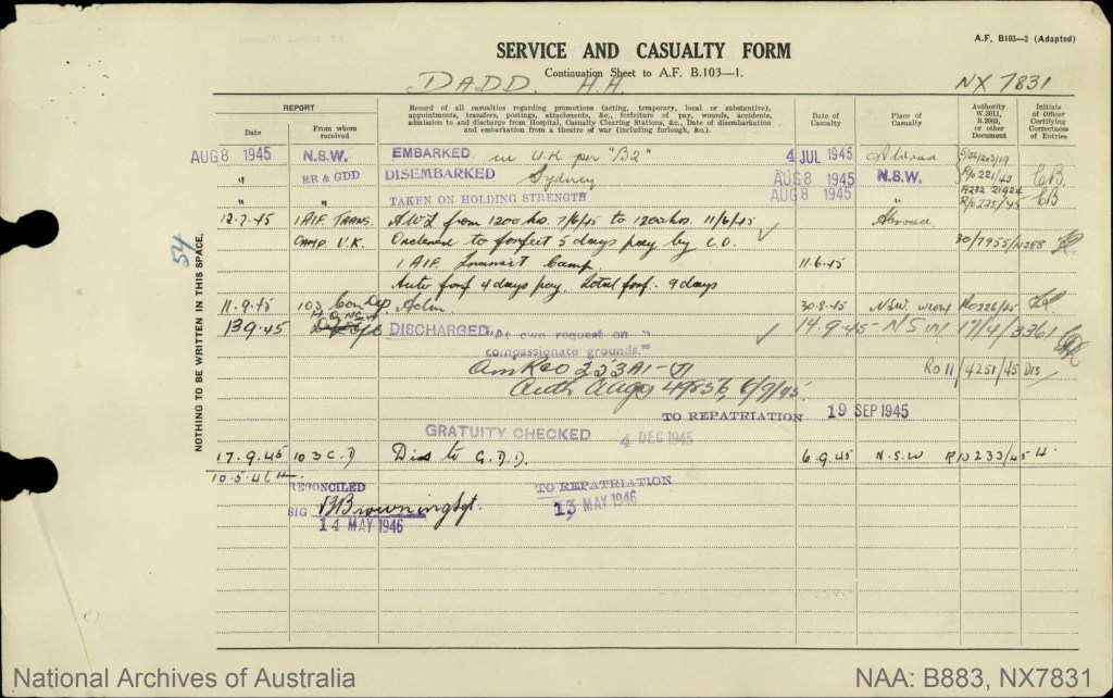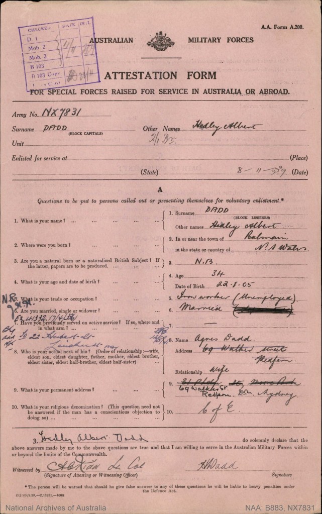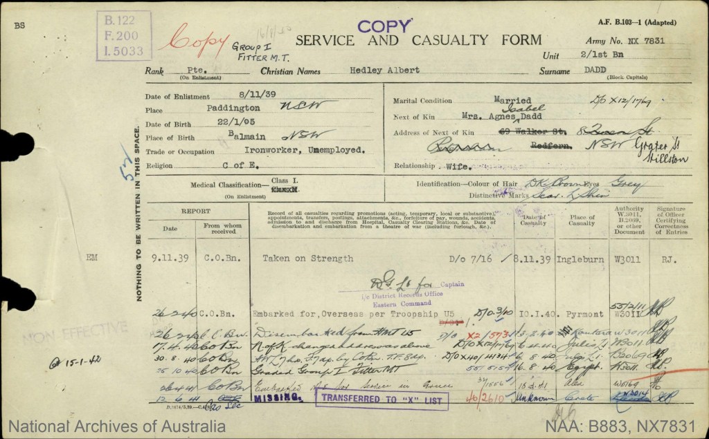 Casualty Section / 2nd Echelon / Army No. NX7831 Christian Names: Hedley Albert Surname: Dadd 22.1.1902 22.1.1905 Balmain NSW 8103 Rank: Private 7939 Unit: 2/1 Inf Bn 30.5.1941 Crete Particulars of Casualty Missing 9.6.1941 POW int Staag VIII B 2.1.1942 At 8B now Stalag 344 15.1.44 Recovered POW Arrived UK 24.5.45
