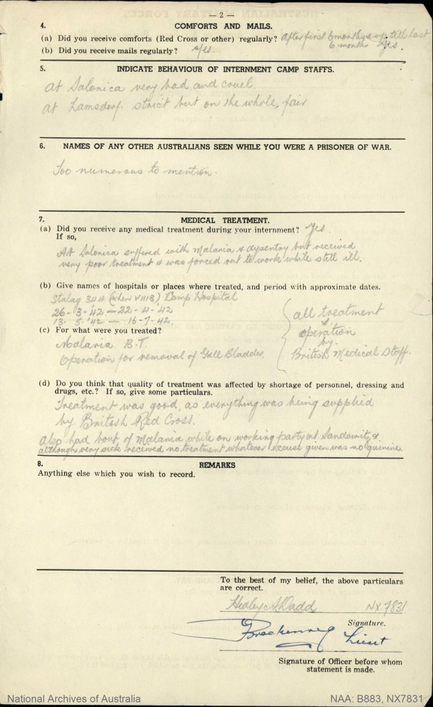 From July to 1 October 1941, Hedley was interned in Salonica, Greece. Hedley wrote “Salonica everything bad. No bedding, lighting or heating.” Behaviour of internment camp staff “At Salonica very bad and cruel”. “At Salonica suffered with malaria & dysentery but received very poor treatment & was forced out to work while still ill.”