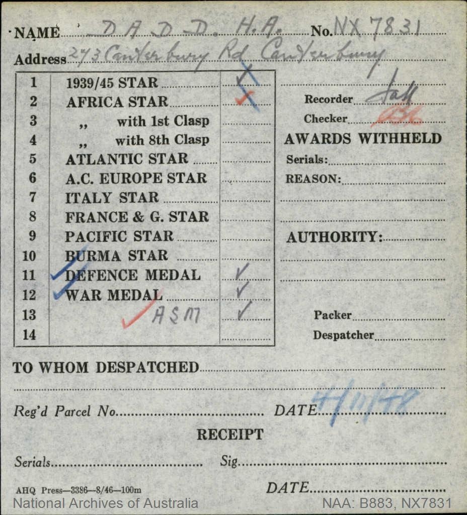On 4 November 1948, Hedley was awarded the 1939/45 Star, the Africa Star, the Defence Medal, War Medal, and the Australian Service Medal.