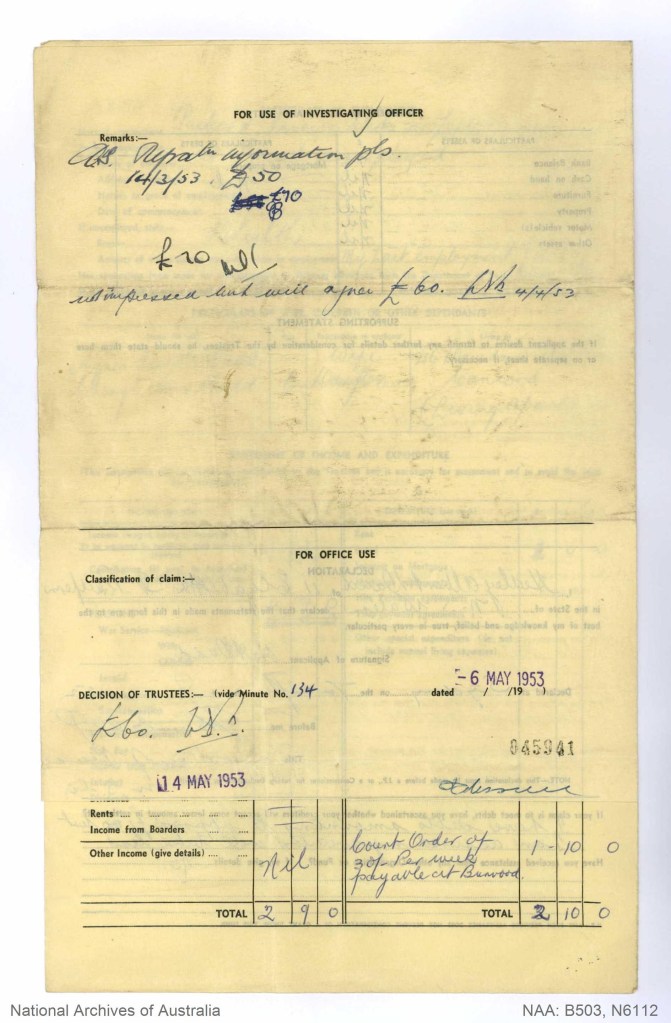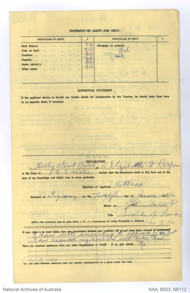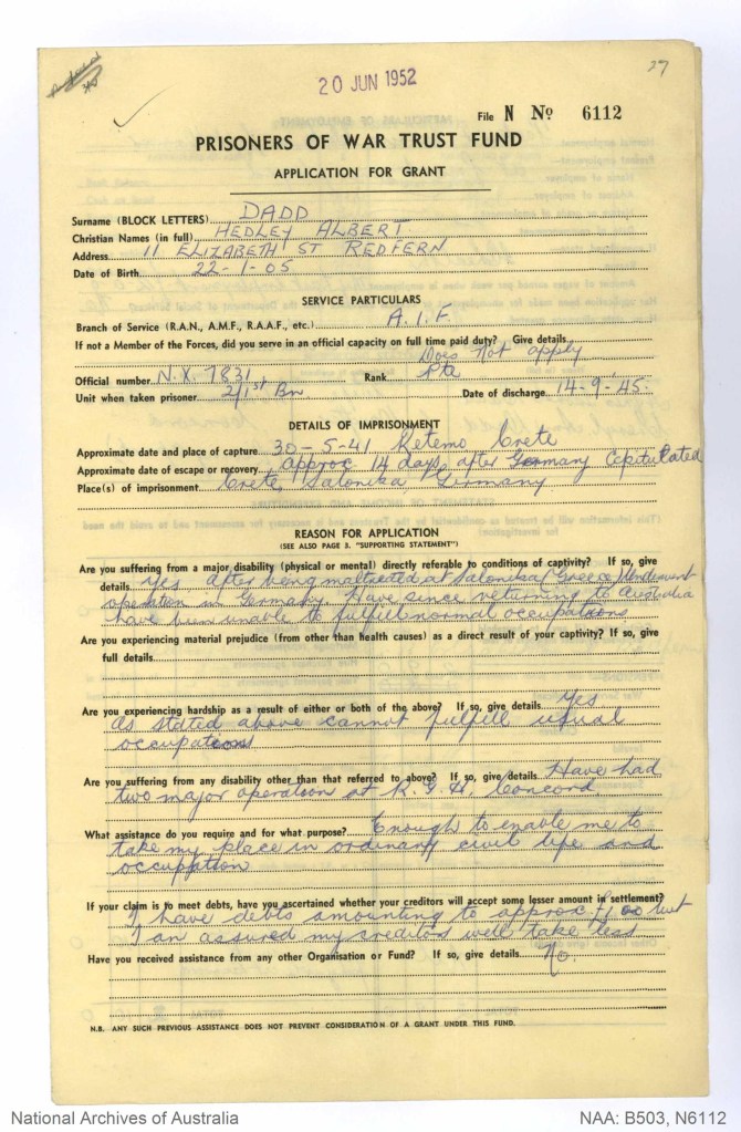 In 1952, Hedley submitted a Prisoners of War Trust Fund Application.