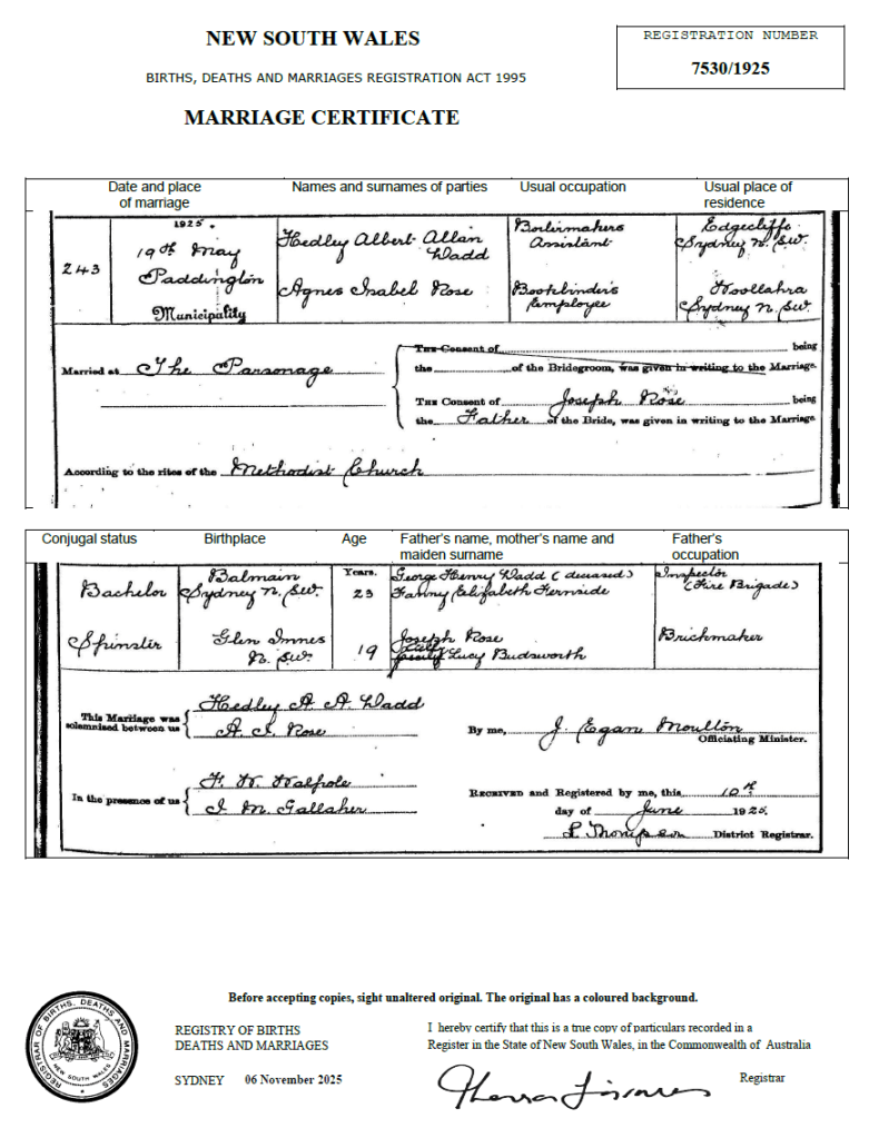 On 19 May 1925, Hedley married Agnes Isobel Rose in Paddington, NSW.