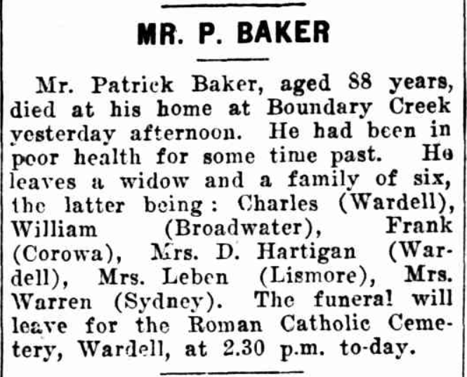 On 5 June 1932, Patrick Baker died aged 88 in Boundary Creek, Wardell, NSW.