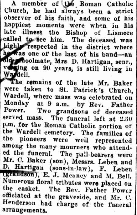 The remains of the late Mr. Baker were taken to St Patrick’s Church, Wardell, where mass was celebrated on Monday at 9 a.m. by Rev. Father Power. Two grandsons of deceased served mass. The funeral left at 2.30p.m. for the Roman Catholic portion of the Wardell cemetery. The families of the pioneers were well represented among the many mourners who attended the funeral. The pall-bearers were Mr. C. Baker (son), Messrs. Leben and D. Hartigan (sons-in-law), F. Leben (grandson), E. J. Mcaney and M. Bell. Numerous floral tributes were placed on the casket. The Rev. Father Power officiated at the graveside, and Mr. C. Henderson had charge of the funeral arrangements.