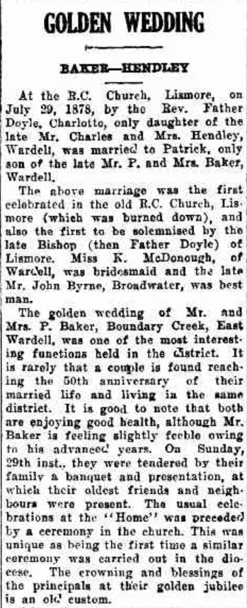The golden wedding of Mr. and Mrs. P. Baker, Boundary Creek, East Wardell, was one of the most interesting functions held in the district. It is rarely that a couple is found reaching the 50th anniversary of their married life and living in the same district. It is good to note that both are enjoying good health, although Mr. Baker is feeling slightly feeble owing to his advanced years. On Sunday, 29th inst.. they were tendered by their family a banquet and presentation, at which their oldest friends and neighbours were present. The usual celebrations at the “Home” was preceded by a ceremony in the church. This was unique as being the first time a similar ceremony was carried out in the diocese. The crowning and blessings of the principals at their golden jubilee is an old custom.