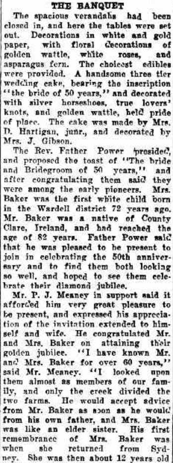 The Rev. Father Power presided, and proposed the toast of “The bride arid Bridegroom of 50 years,” and after . congratulating them said they were, among the early pioneers. Mrs. Baker was the first white child born in the “Wardell district 72 years ago. Mr. Baker was a native of County Clare, Ireland, and had reached the age of 82 years. Father Power said that he was pleased to be present to join in celebrating the 50th anniversary and to find them- both looking so well, and hoped to see them celebrate their diamond jubilee.