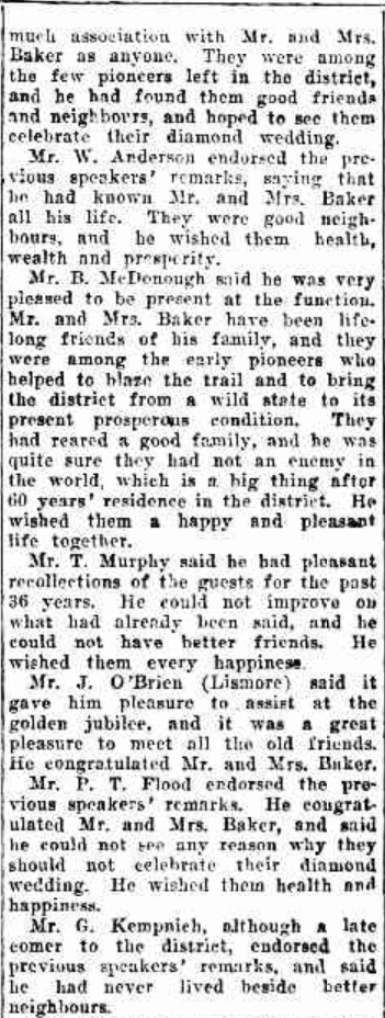 Mr. P. J. Meaney in support said it afforded him very great pleasure to be present, arid expressed his appreciation of the invitation. extended to him self and “wife. He congratulated Mr. and Mrs. Baker on attaining their golden jubilee.’ “I have known Mr. and Mrs. Baker for over 60 years,” said Mr. Meaney. “I looked upon them almost as members of our family, and only the creek divided the two farms. He would accept advice from Mr. Baker as soon as he would from his own father, and Mrs. Baker was like an elder sister. His first remembrance of Mrs. Baker was when she returned from Sydney. She was then about 12 years old.
