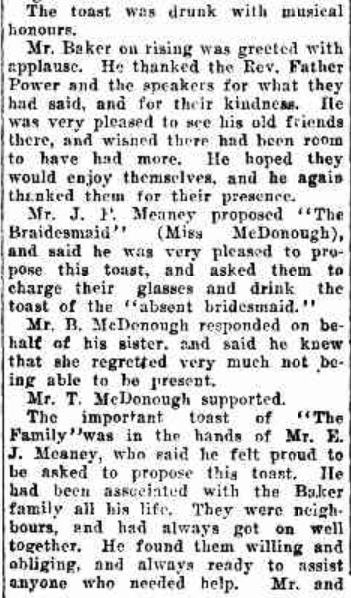 The important toast of “The Family “was in the hands of Mr. E. J. Meaney, who said he felt proud to be asked to propose this toast. He had been associated with the Baker family all his life. They were neighbours, and had always got on well together. He found them willing and obliging, and always ready to assist anyone who needed help. Mr. and