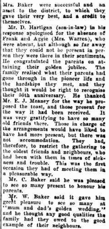 Mr. D. Hartigan (son-in-law) in his response apologised for the absence of Frank and Aggie (Mrs. Warren), who were absent, but although so far away, that they, could not be present in person they were there in their sentiments. He congratulated the parents on attaining. their golden jubilee. The family realised what their parents had gone through in the pioneer life and the hardships they met, and they thought it would be right to recognise their 50th anniversary. He thanked Mr. E. J. Meanev for the way he proposed the toast, and those present for the way it had been received. It was very gratifying to have so many old friends there. Those in charge of the arrangements would have liked to have had more present, but there was | not accommodation. They had, therefore, to restrict the gathering to the oldest friends and neighbours, had been with them in times of sickness and trouble. This was the first occasion they had of meeting them in a pleasurable way.