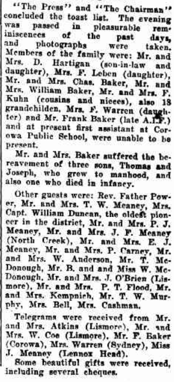 Mr. Baker reared nine children. Two sons, Thomas and Joseph, died in early manhood, and one in infancy. The members living are Charles (War dell), William (East Wardell), Prank (Whitton Public School), Mrs. D. Hartigan (Wardell), Mrs. S. Leben (Lismore), and Mrs. P. Warren (Sydney). There are 22 grandchildren. Her husband died six years ago.
