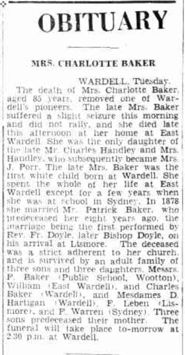 The death of Mrs. Charlotte Baker, aged 85 years, removed one of Wardell’s pioneers. The late Mrs. Baker suffered a slight seizure this morning and did not rally, and she died late this afternoon at her home at East Wardell. She was the only daughter of the late Mr. Charles Handley and Mrs. Handley, who subsequently became Mrs. J. Porr. The late Mrs. Baker was the first white child born at Wardell. She spent, the whole of her life at East Wardell except for a few years when she was at school in Sydney. In 1878 she married Mr. Patrick Baker, who predeceased her eight years ago, the marriage being the first performed by Rev. Fr. Doyle, later Bishop Doyle, on his arrival at Lismore. The deceased was a strict adherent to her church, and is survived by an adult family of three sons and three daughters. Messrs. P. Baker (Public School, Wootton), William (East Wardell), and Charles Baker (Wardell), and Mesdames D. Hartigan (Wardell), F. Leben (Lismore), and F. Warren (Sydney). Three sons predeceased their mother. The funeral will take place to-morrow at 2.30 p.m. at Wardell.
