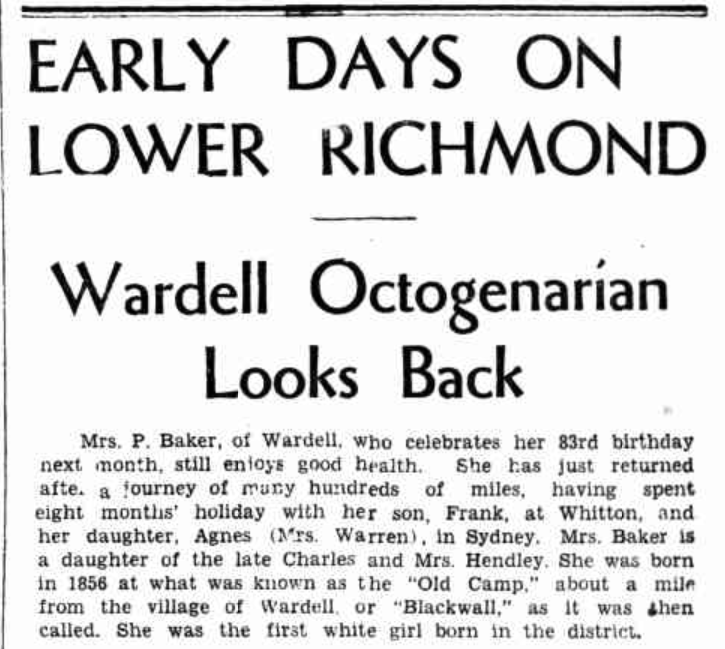 Mrs. P. Baker, of Wardell, who celebrates her 83rd birthday next month, still enjoys good health. She has just returned after a Journey of many hundreds of miles, having spent eight months’ holiday with her son, Frank, at Whitton, and her daughter, Agnes (Mrs. Warren), in Sydney. Mrs. Baker is a daughter of the late Charles and Mrs. Hendley. She was born in 1856 at what was known as the “Old Camp,” about a mile from the village of Wardell, or “Blackwall,” as it was then called. She was the first white girl born in the district.