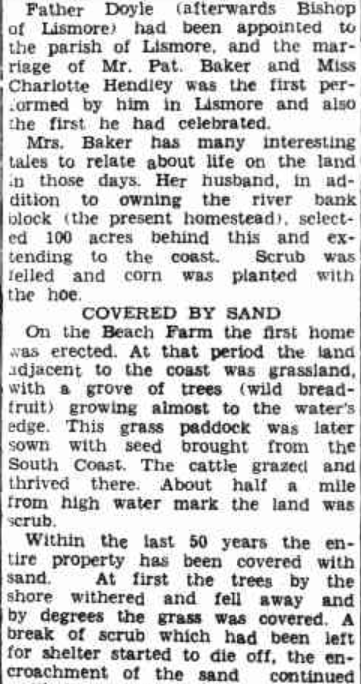 Father Doyle (afterwards Bishop of Lismore) had been appointed to the parish of Lismore, and the marriage of Mr. Pat. Baker and Miss Charlotte Hendley was the first performed by him in Lismore and also the first he had celebrated. Mrs. Baker has many interesting tales to relate about life on the land in those days. Her husband, in addition to owning the river bank block (the present homestead), selected 100 acres behind this and extending to the coast. Scrub was felled and corn was planted with the hoe.