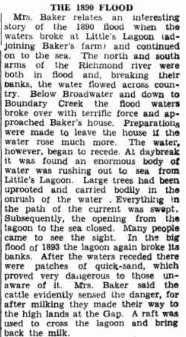Mrs. Baker relates an interesting story of the 1890 flood when the waters broke at Little’s Lagoon (adjoining Baker’s farm) and continued on to the sea. The north and south, arms of the Richmond river were both in flood and, breaking their banks, the water flowed across country. Below Broadwater and down to Boundary Creek the flood waters broke over with terrific force and approached Baker’s house, preparations were made to leave the house if the water rose much more. The water, however, began to recede. At daybreak it was found an enormous body of water was rushing out to sea from Little’s Lagoon. Large trees had been, uprooted and carried bodily in the onrush of the water . Everything in the path of the current was swept. Subsequently, the opening from the lagoon to the sea closed. Many people came to see the sight. In the big flood of 1893 the lagoon again broke its banks. After the waters receded there were patches of quick-sand, which proved very dangerous to those unaware of it. Mrs. Baker said the cattle evidently sensed the danger, for after milking they made their way to the high lands at the Gap. A raft was used to cross the lagoon and bring back the milk.
