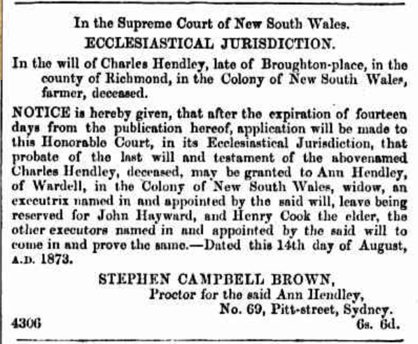 NOTICE is hereby given, that after the expiration of fourteen days from the publication hereof, application will be made to this Honorable Court, in its Ecclesiastical Jurisdiction, that probate of the last will and testament of the above named Charles Hendley, deceased, may be granted to Ann Hendley, of Wardell, in the Colony of New South Wales, widow, widow, an executrix named in and appointed by the said will, leave being reserved for John Hayward, and Henry Cook the elder, the other executors named in and appointed by the said will to come in and prove the same.—Dated this 14th day of August, A.D. 1873.