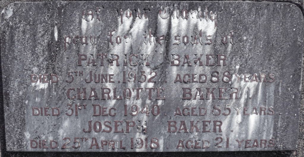 On 31 December 1940, Charlotte Baker died, aged 85 years. Charlotte is buried at Wardell, NSW, with her husband Patrick and their youngest child Joseph, who died aged 21.
