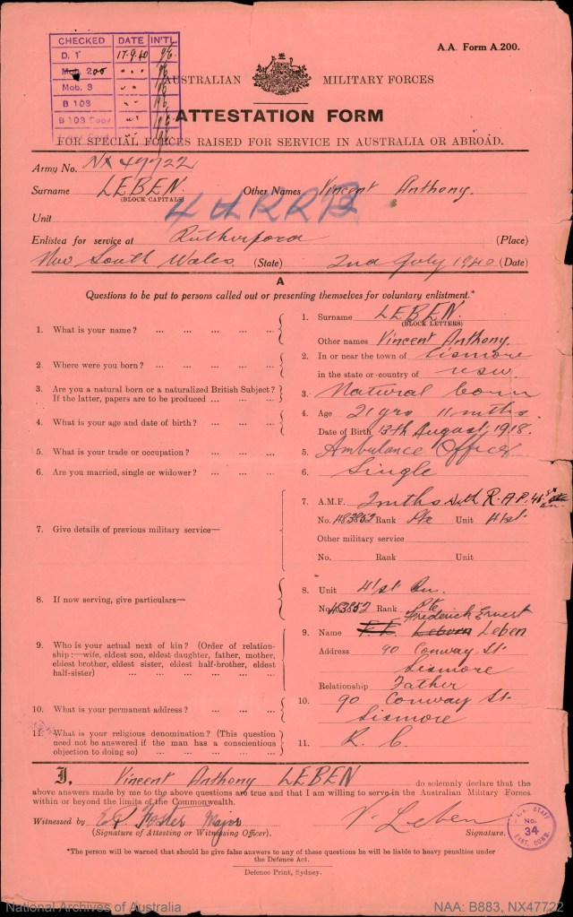 On 2 July 1940, Vincent enlisted in the Australian Military. His attestation form stated: