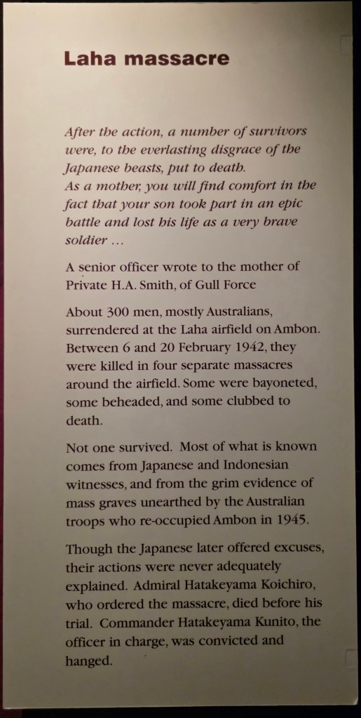 About 300 men, mostly Australians, surrendered at the Laha airfield on Ambon. Between 6 and 20 February 1942, they were killed in four separate massacres around the airfield. Some were bayoneted, some beheaded, and some clubbed to death.
