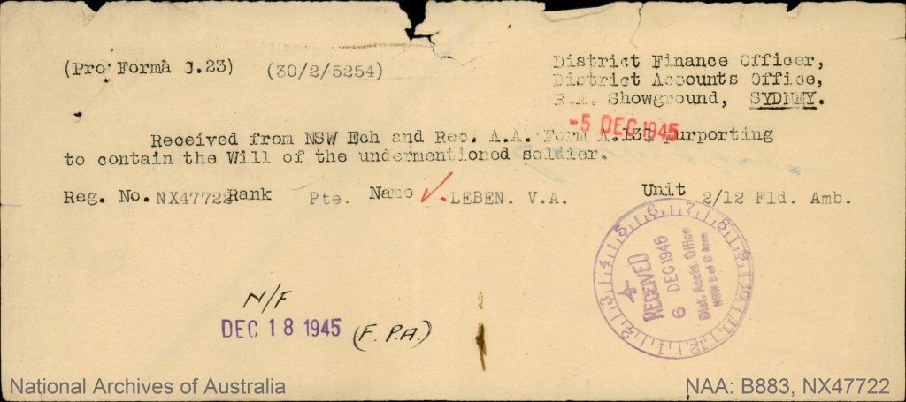 - Next of Kin – Father – Frederick Ernest Leben, 90 Conway Street, Lismore, NSW.