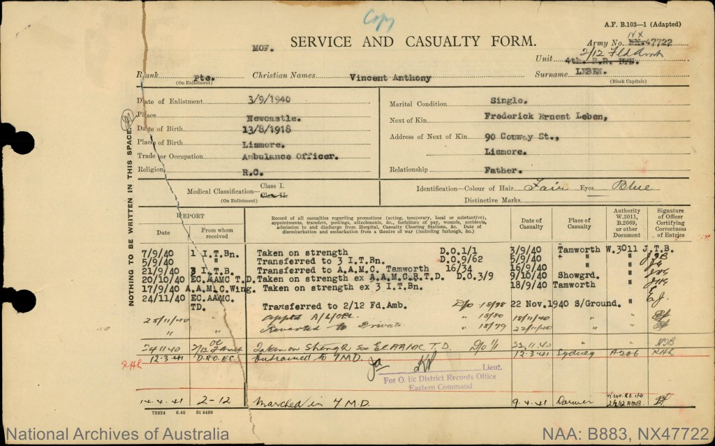Vincent Anthony Leben was born on 13 August 1918, in Lismore, New South Wales, the third child of Mary Baker (1883-1942) and Frederick Ernest Leben (1886-1957).